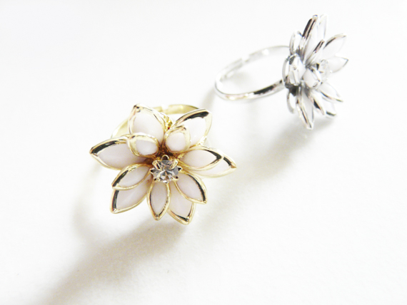 This dainty white-petalled flower ring is beautiful to look at! It is outlined in gold and fully adjustable to fit any ring size. It looks great with casual and dinner wear, and is also pretty heavy and very solid.