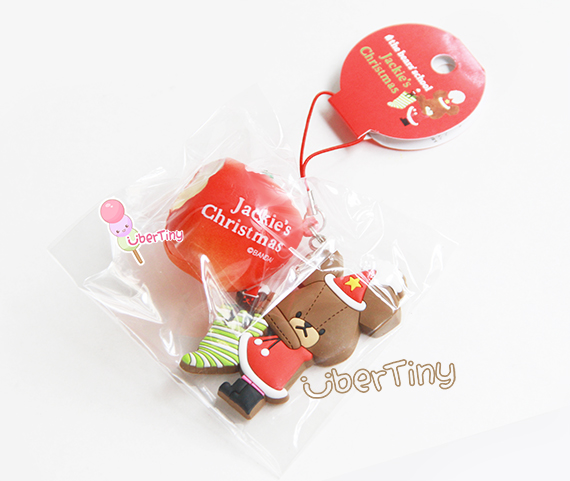 This Bears' School squishy bitten apple comes with a cute bendable rubber tag with Jackie in a Santa costume, holding a party sock and with a hat (: